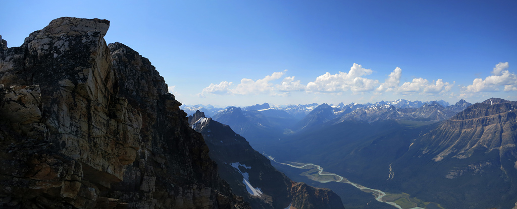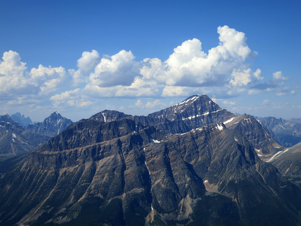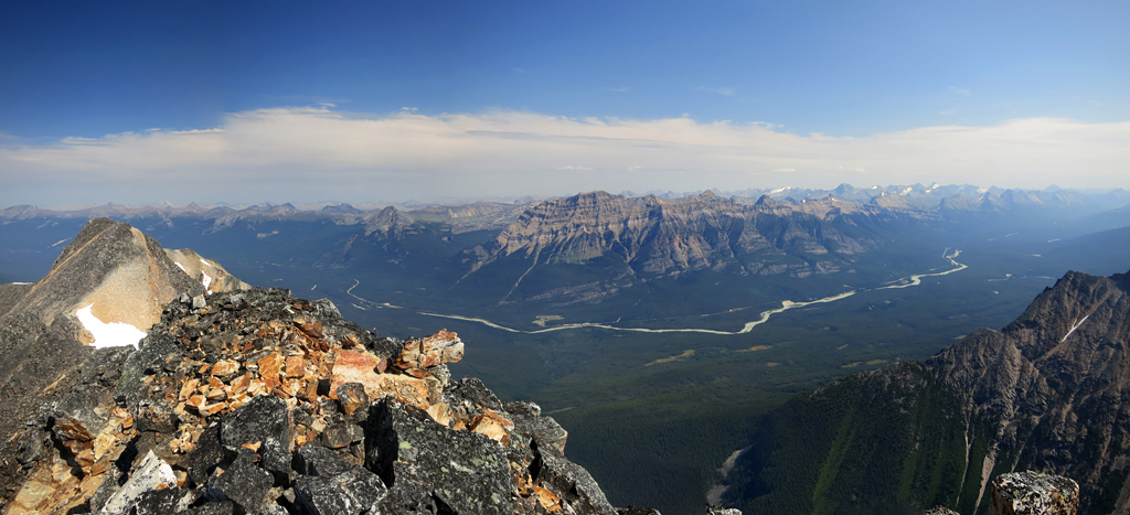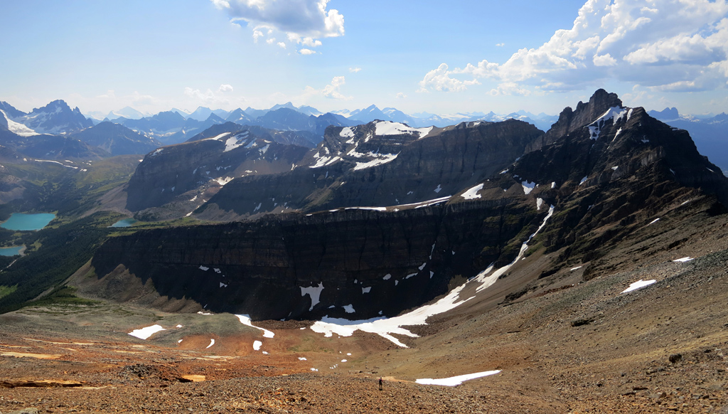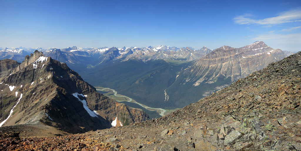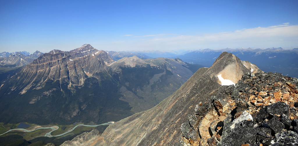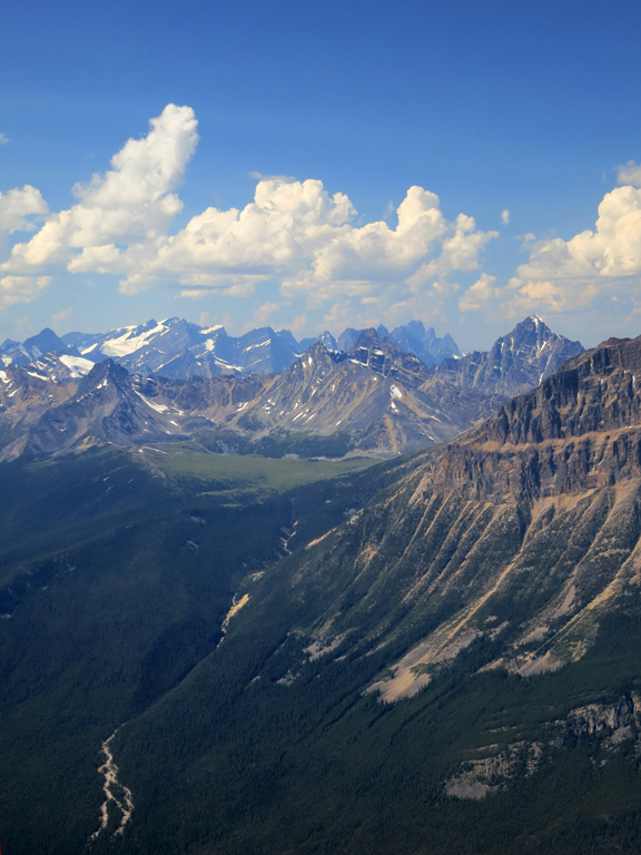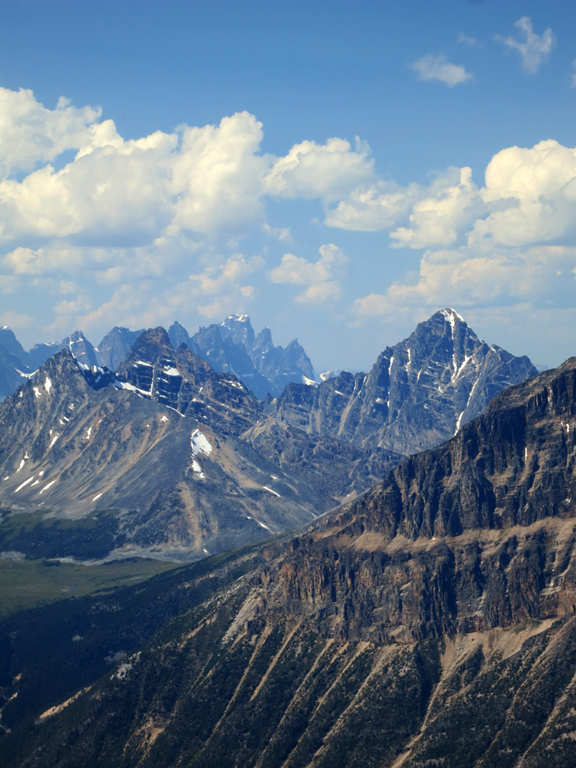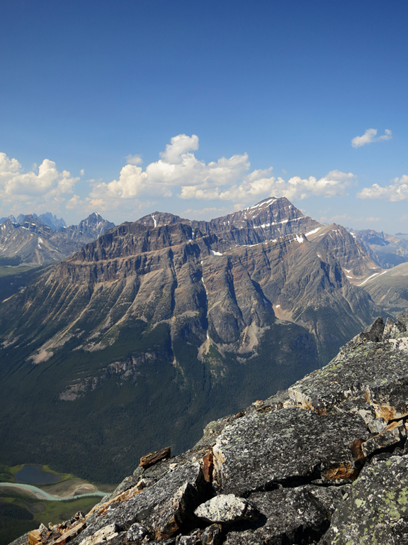Geraldine Peak (a.k.a. Whirlpool Mountain) is a highly prominent mountain in Jasper National Park that's bounded by broad valleys on all sides, and not only offers exceptional views for long distances in every direction, but also a great diversity of views. Aside from providing an excellent vantage point to survey nearby Mt. Fryatt and Mt. Edith Cavell, two of Jasper's tallest mountains, travellers here will also be treated to Geraldine's many emerald lakes and the dramatic, razor-like peaks which dominate the landscape between Verdant Pass and the Tonquin Valley, and also between Mt. Fryatt and the distant Mt. Clemenceau, which is visible from 50km away.