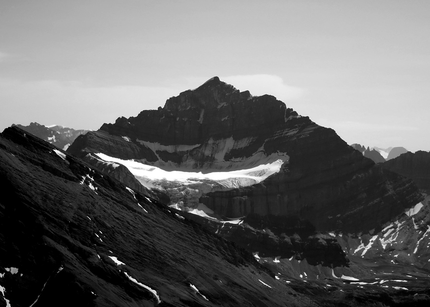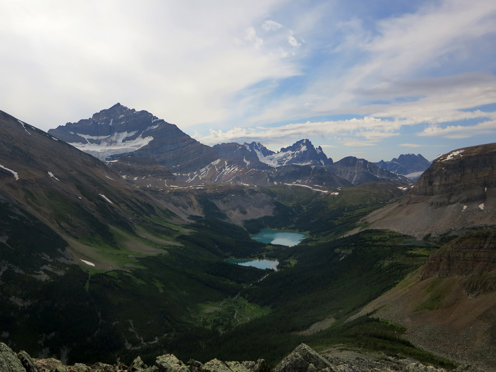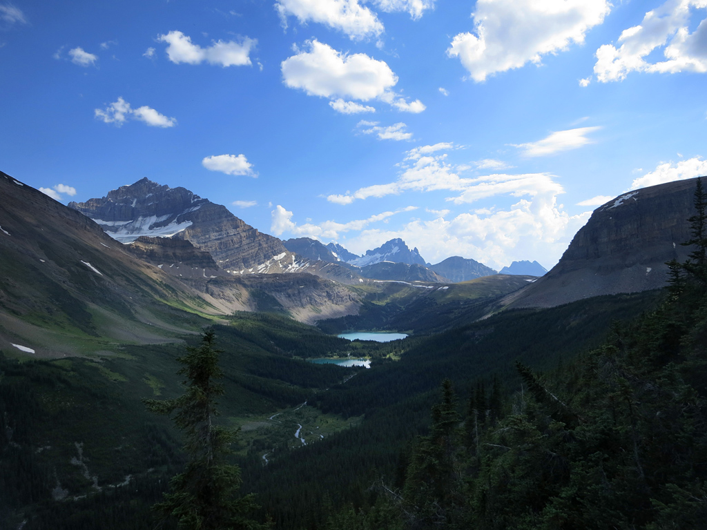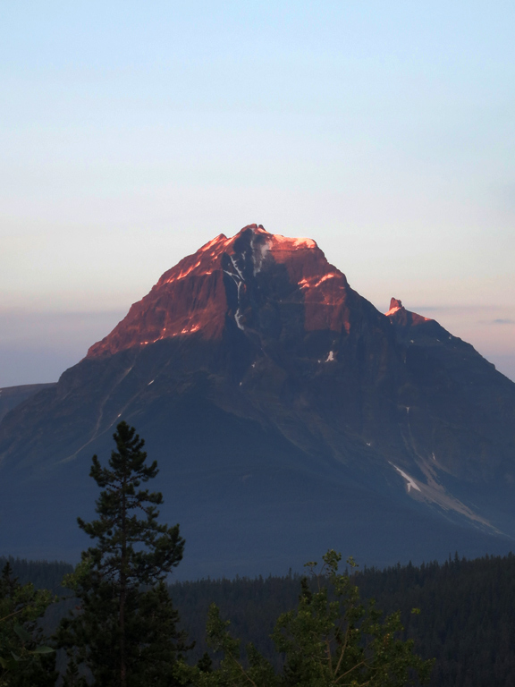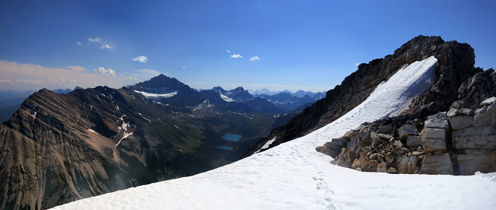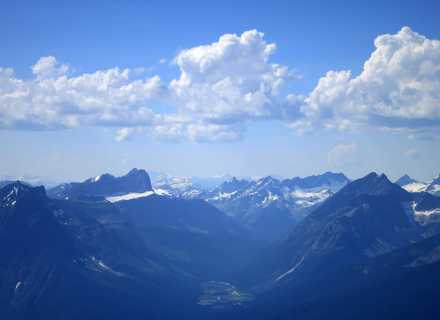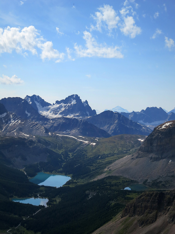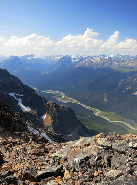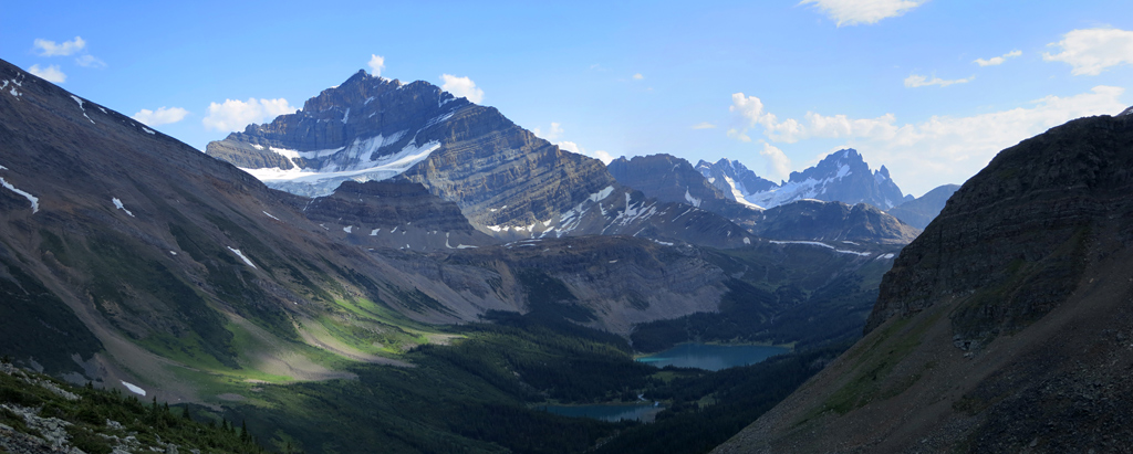 Geraldine Peak (a.k.a. Whirlpool Mountain) is a highly prominent mountain in Jasper National Park that's bounded by broad valleys on all sides, and not only offers exceptional views for long distances in every direction, but also a great diversity of views. Aside from providing an excellent vantage point to survey nearby Mt. Fryatt and Mt. Edith Cavell, two of Jasper's tallest mountains, travellers here will also be treated to Geraldine's many emerald lakes and the dramatic, razor-like peaks which dominate the landscape between Verdant Pass and the Tonquin Valley, and also between Mt. Fryatt and the distant Mt. Clemenceau, which is visible from 50km away.