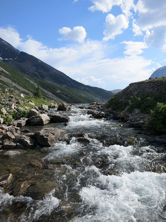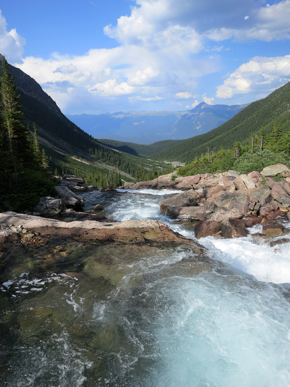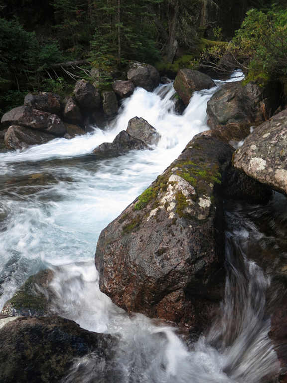 Digressions aside, once you've followed the trail to First Geraldine Lake and then contoured around its northwestern flank, you'll encounter the first boulder field of the day that's fairly short and well-marked with cairns and yellow diamonds. You'll soon find yourself back on the trail, passing a series of small waterfalls as you climb towards a plateau between the first and second lakes.