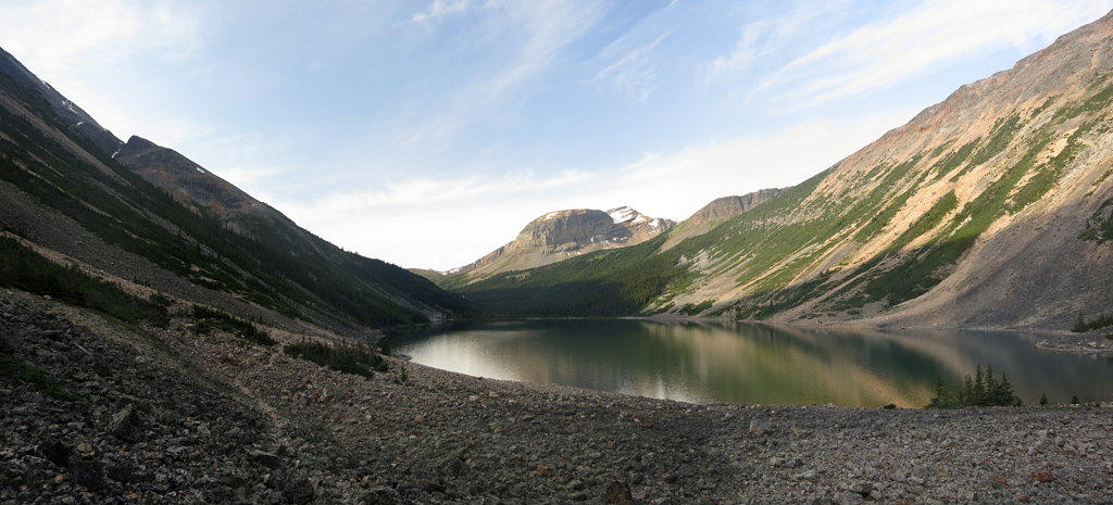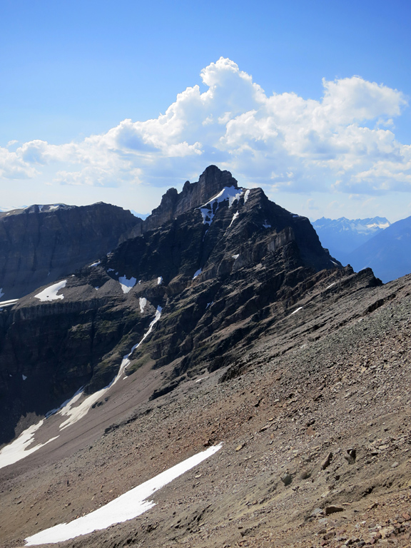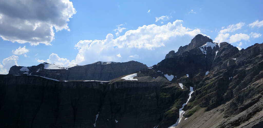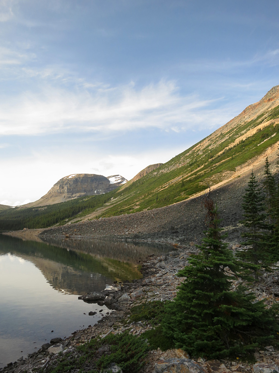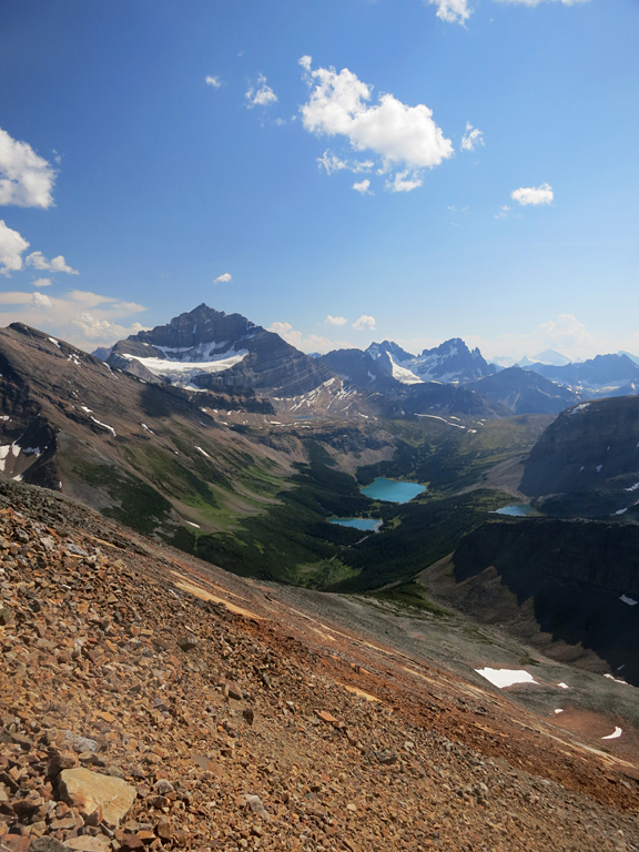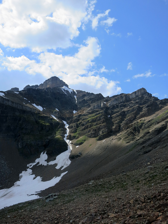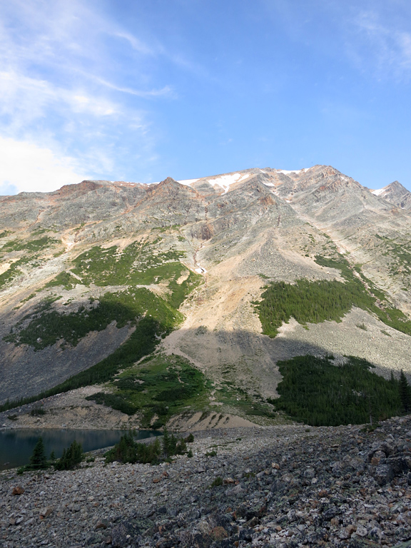 Note: It may be possible, if not preferable, to take a more direct route up the mountain from around the northeast end of Second Lake. I can't comment on how difficult such a route would become nearer to the top, as some of the gullies were snow filled, but if feasible, it would save a considerable amount of time. However, at the same time, the best views of Fryatt and its tarns, Geraldine's sub-peaks, and Geraldine's Upper Lakes all come from the southwest end of Geraldine Peak, which you would completely bypass.