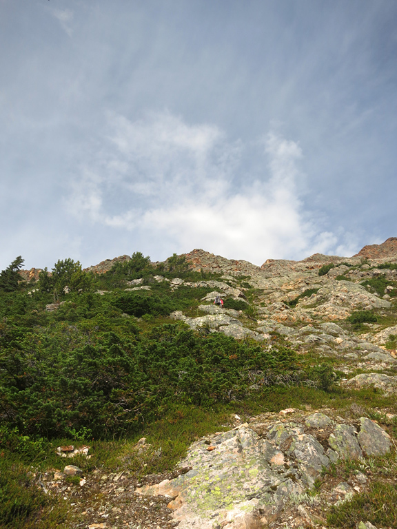 Unfortunately this route brought us to a part of the southwest ridge that's heavily vegetated all the way down to the lake. We probably could have re-ascended the ridge a bit to a cleaner descent route, and it's also possible we could have found a better route by descending further along the ridge to the southwest. However, we were tired and just wanted to get on with it; so we began to bushwhack and shrub-walk our way, diagonally down the mountain towards Second Geraldine Lake. I suppose I should define shrub-walking. The shrubbery was so dense on this slope that we were often walking purely on branches, usually a foot or two off of the ground.