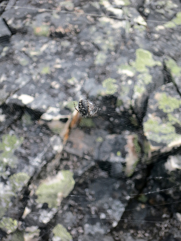The climb to the false summit up the ridge is a combination of boulder-hopping and slab climbing which, thanks to being covered in a kind of black lichen, was surprisingly grippy. If you're not concerned about looking cool, running up these slabs like a primate (on all fours) will allow you to gain elevation very quickly. Keep an eye out for the incredible amount of spider webs while boulder-hopping here; there are literally hundreds of dime-sized black spiders at work on this ridge, and a trekking pole becomes an invaluable spider-whacking tool for this section.