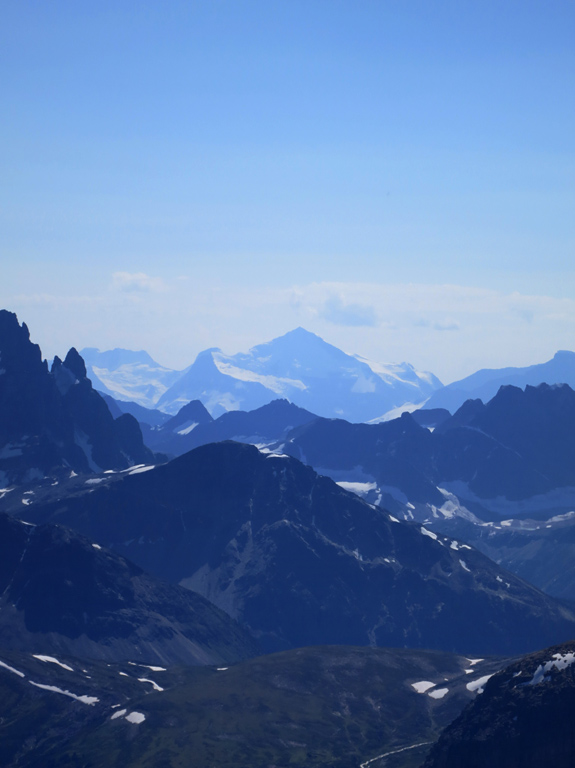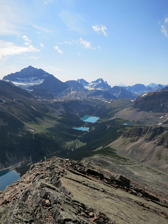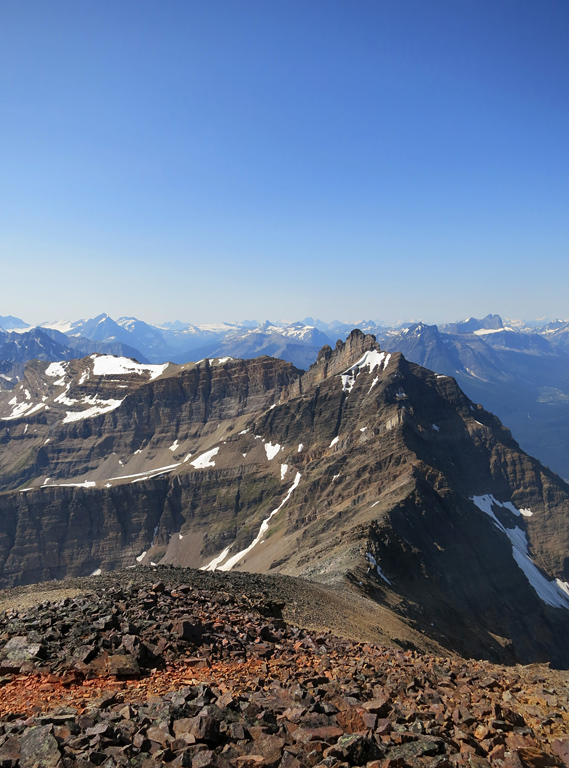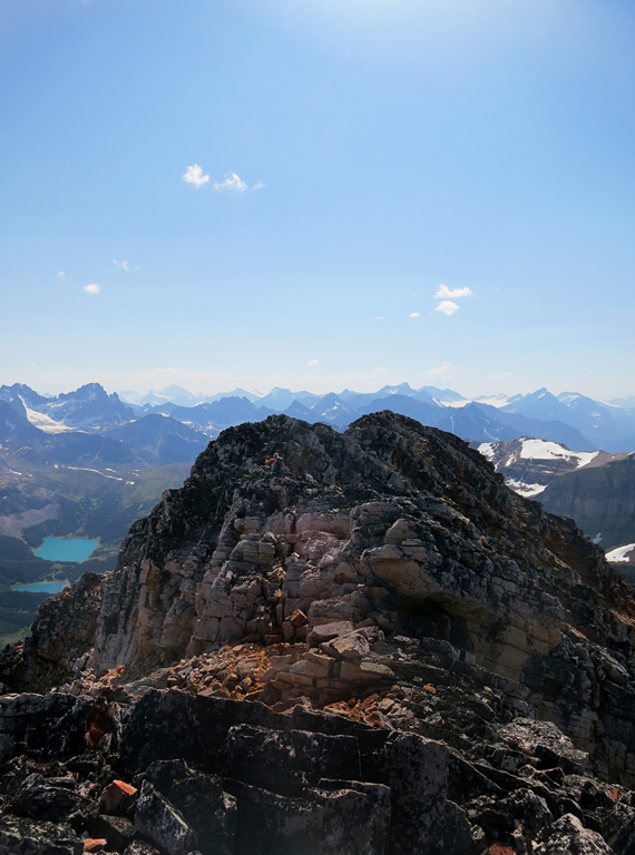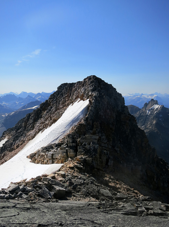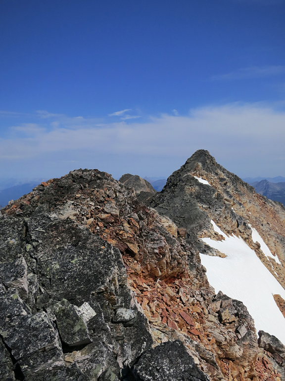 You can continue traversing east beyond the true summit to another high point with a large cairn (which marks the top of the alpine approach route). However, some of the downclimbing required to complete this traverse is apparently quite difficult according to Eric, “a climber's scramble”, and should be approached cautiously.