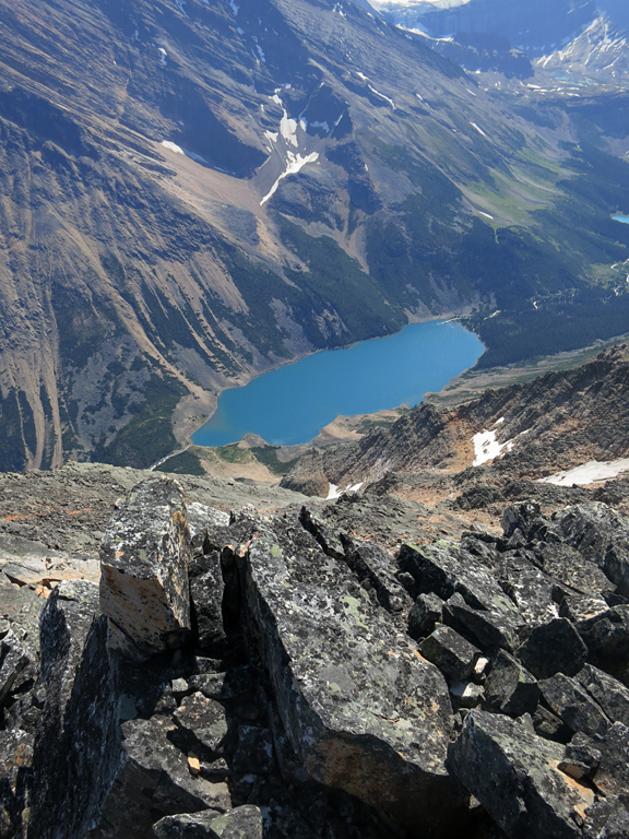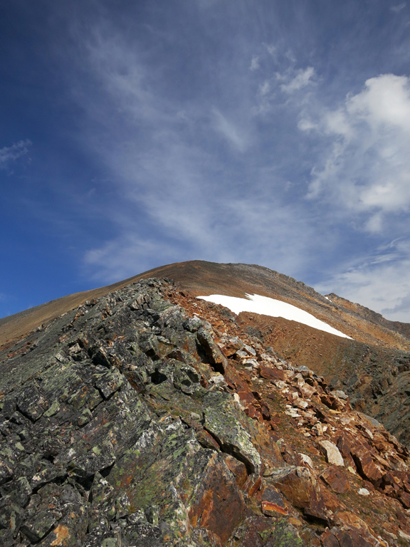 I was curious as to why the top of the alpine route (the next highpoint at the northeast end of the ridge) has a much larger cairn than the actual summit, and we soon found the reason why; the very top of the actual summit is a loose rock pile where every step triggers movement, which isn't exactly conducive to lasting cairn construction. We also discovered that neither peak had a register, which was disappointing. It would have been interesting to know how often Geraldine's climbed.