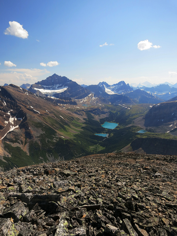 For the descent, we retraced the route along the ridge and then took a more direct route down the centre of the southwest face of Geraldine from the first false summit. If travelling in a group you'll want to spread out and descend in parallel paths as, after a certain point, almost every step we took unleashed a cavalcade of material down the mountain. You also need to be careful on the slabs here. Unlike the ones higher up on the mountain, these slabs are lichen free and quite slick, even when dry. After losing most of the elevation to the valley bellow, we begin to traverse over the boulders to the southwest ridge on a slightly upward trajectory.