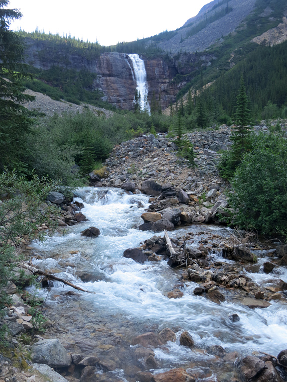 A little while later you'll encounter some avalanche damage that will force you to detour off of the trail. It can be difficult to see, but the trail resumes to the right side of meadow once you've navigated through the debris and soon leads to a nice lookout for the large waterfall at the head of the valley. As you near this waterfall the trail begins to climb steeply to the left, where you'll want to traverse to the right when that path forks after gaining about 60-80m in elevation; this will lead you to Second Geraldine Lake.