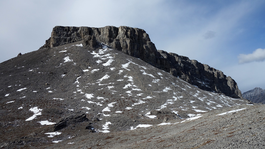 Anyway, back at the crux, I had a flashback to an icy chimney I had negotiated on the third major cliff band on Mt. Chephren where I used my ice axe to ‘clean up’ successive steps until I was through. With no axe at my disposal, I turned to my next best option, pulling out my utility knife and began carving away at the ice. The thin blade wasn't super effective against the hard ice, but after a few minutes work, I was ready to give it a shot... and was very relieved to pull myself onto a small perch above the crux next to a cairn. After taking a moment or two to relax and re-focus, I committed to the upper half of the chimney which, despite its increased exposure, provided a reliable sequence of holds to use.