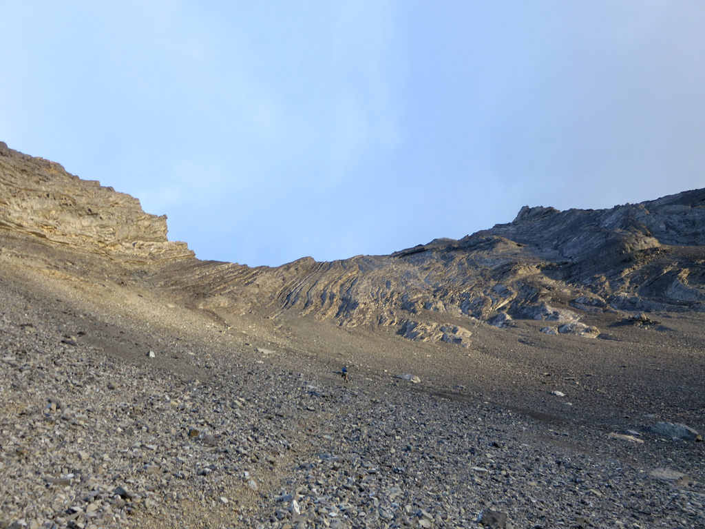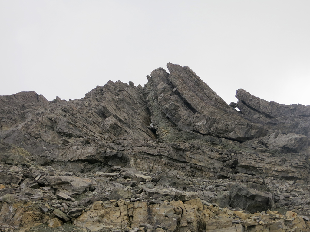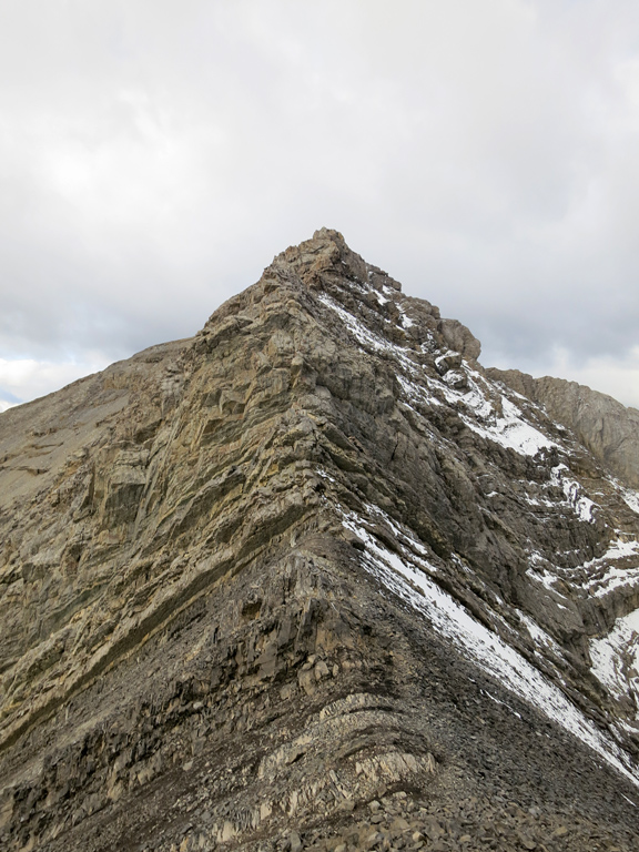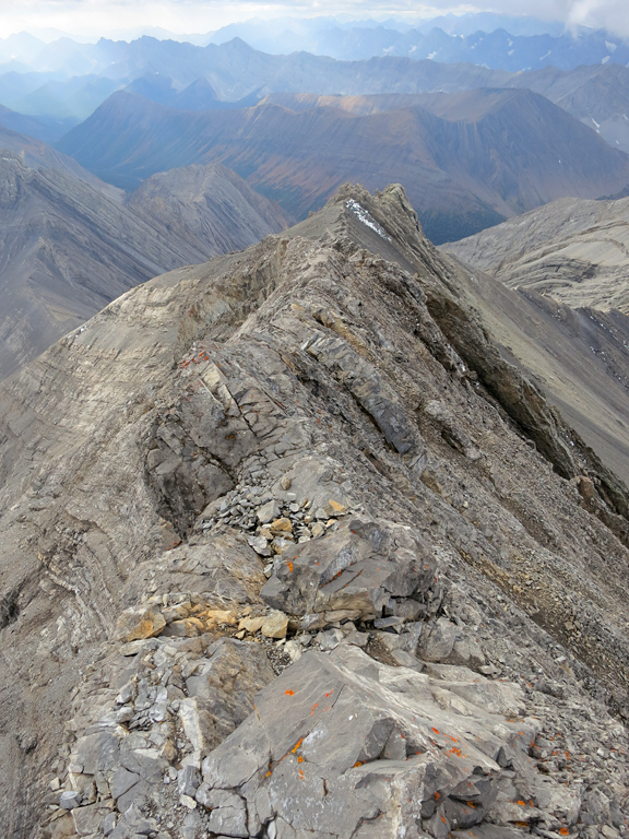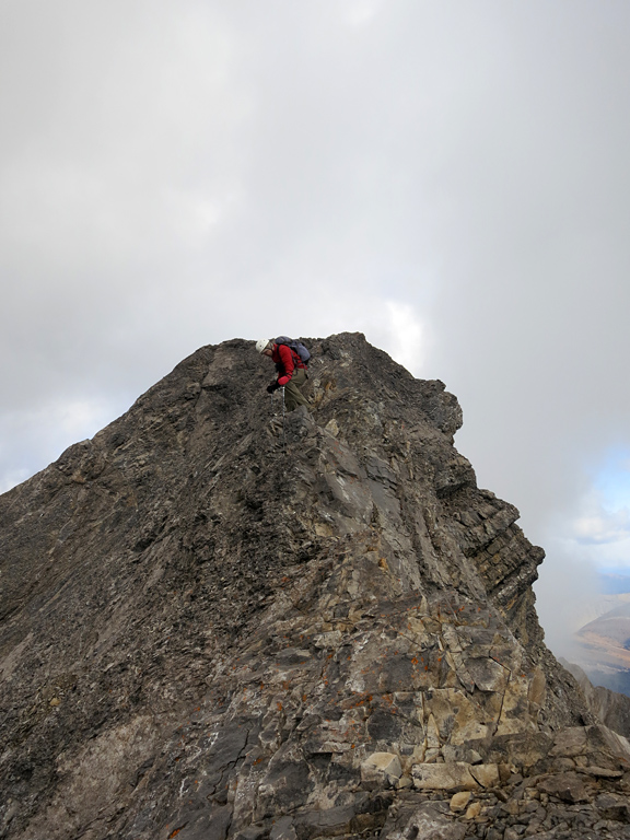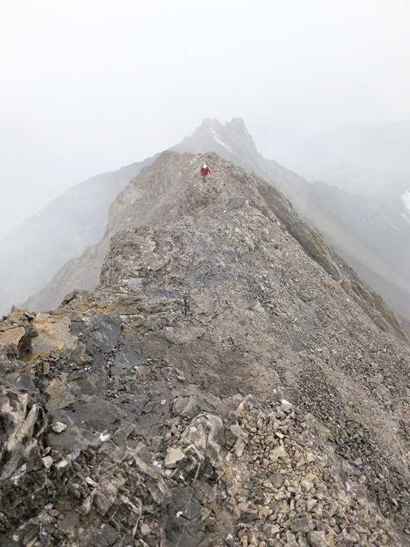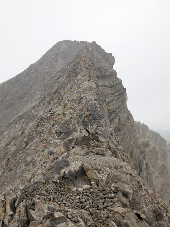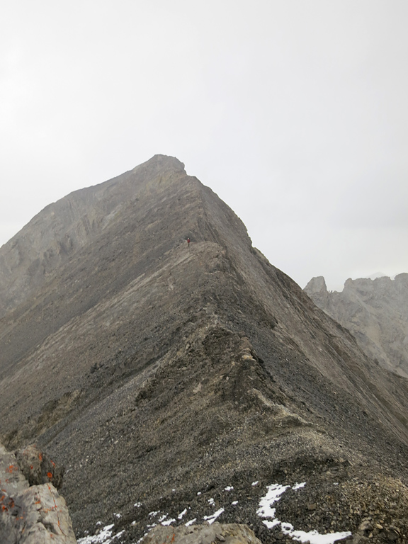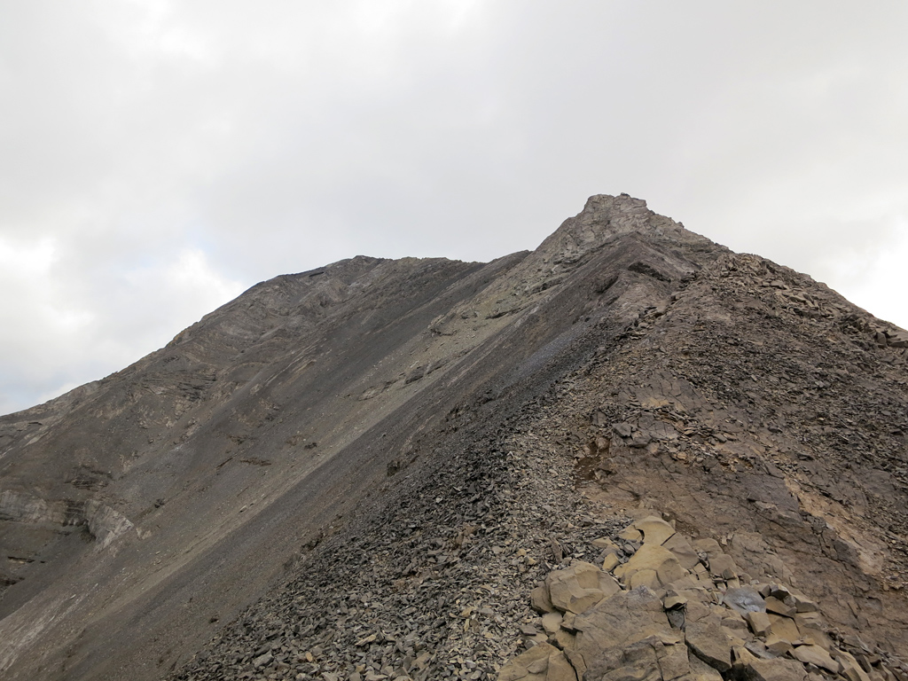A scree trail resumes once you're on the ridge and you should use it to bypass the first highpoint by contouring around it on the climber's left. As you advance further up the ridge towards the summit you will eventually get to choose between scrambling up and along the ridge crest, or taking an easier route (technically, not effort-wise) through the scree on the left side for a while first. If you head for the ridge top be weary of the significant exposure to the climber's right as the can be measured in the hundreds of metres.