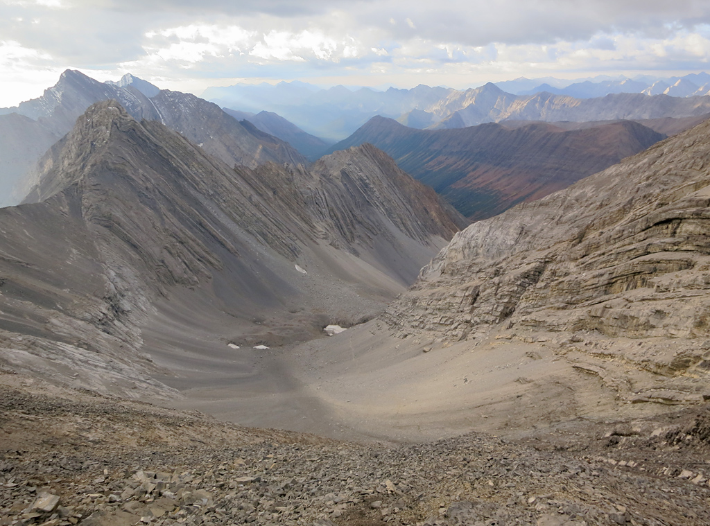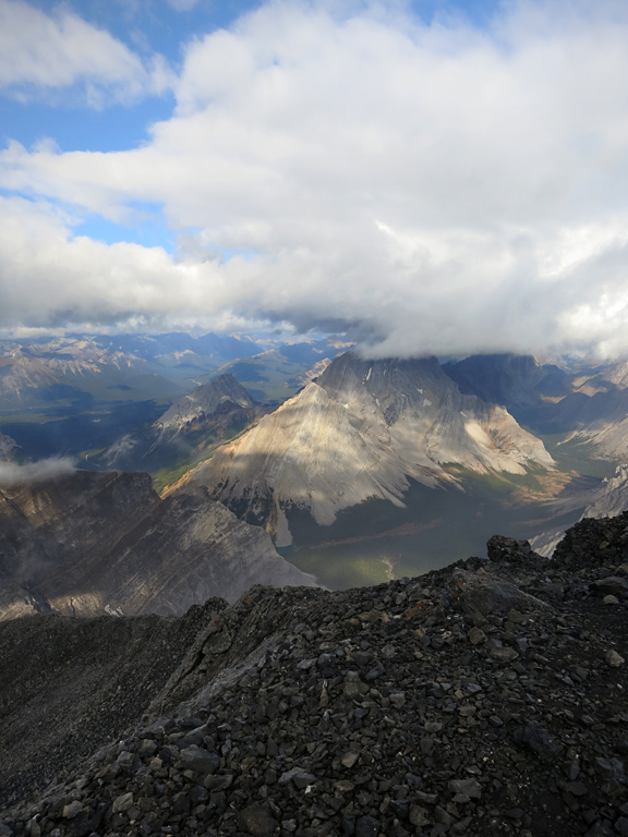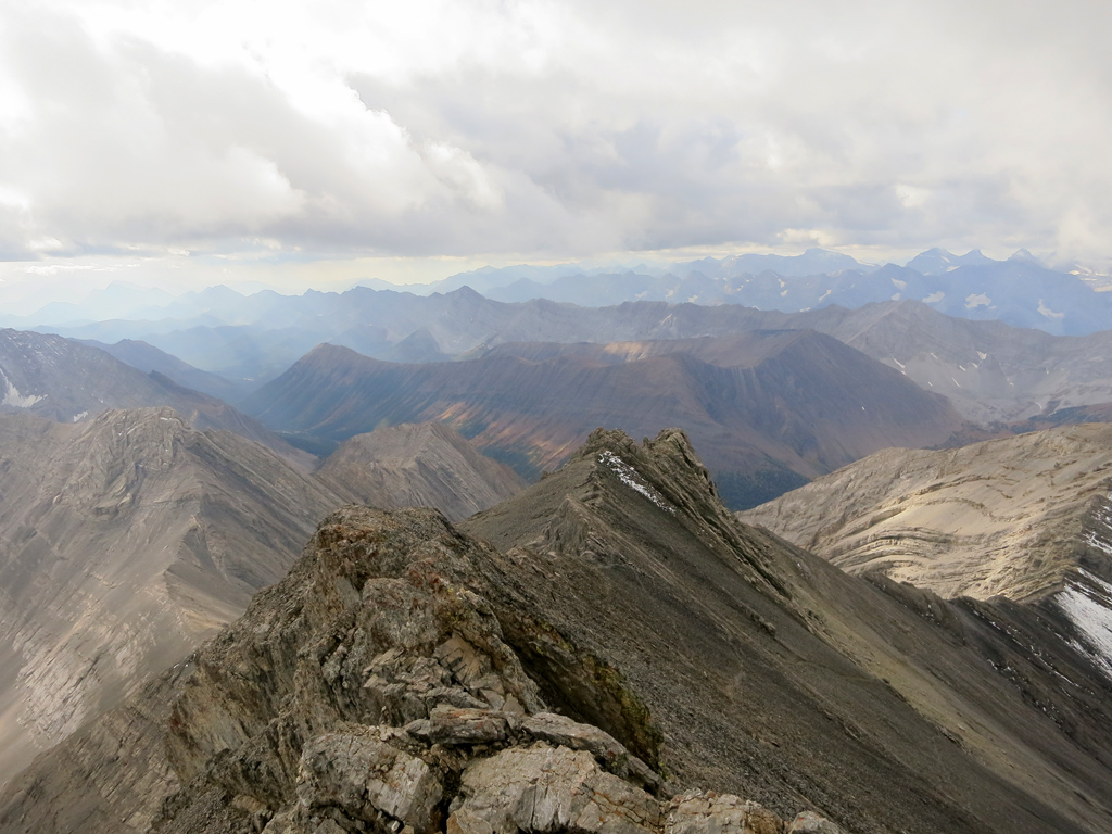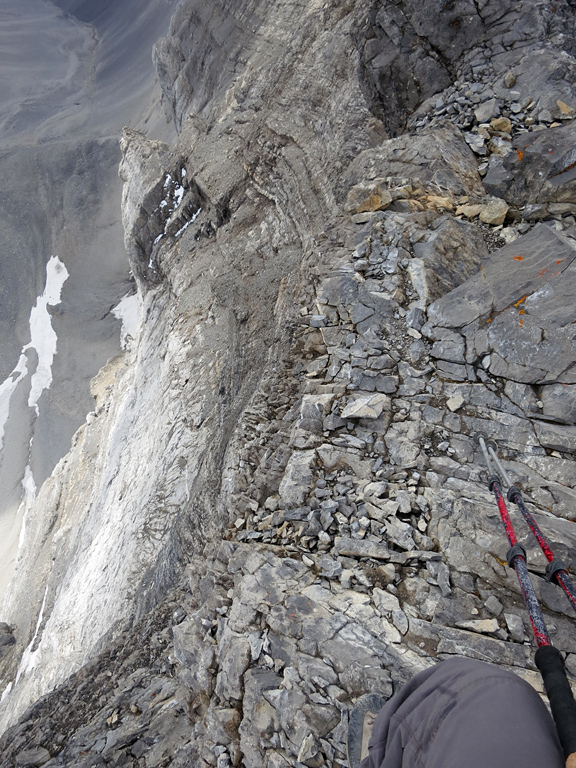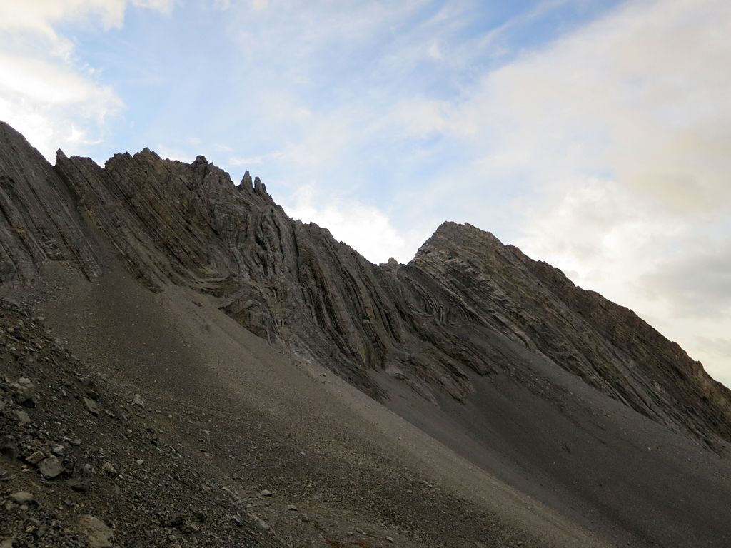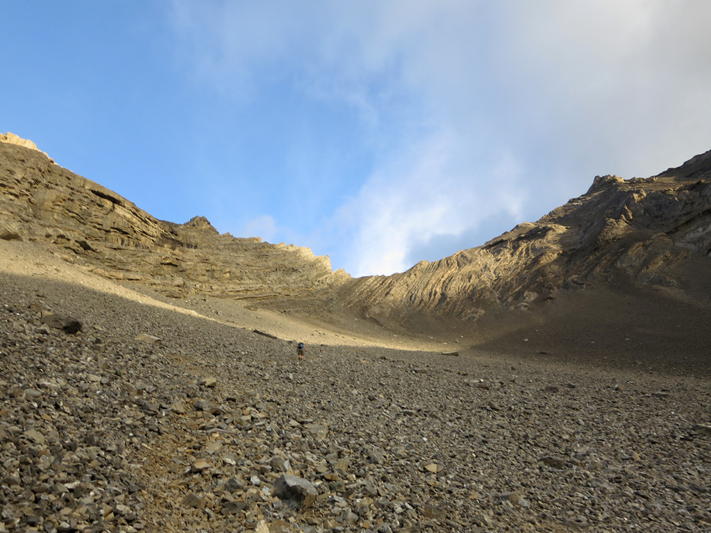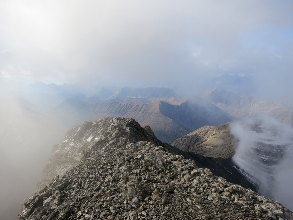 A scree trail resumes once you're on the ridge and you should use it to bypass the first highpoint by contouring around it on the climber's left. As you advance further up the ridge towards the summit you will eventually get to choose between scrambling up and along the ridge crest, or taking an easier route (technically, not effort-wise) through the scree on the left side for a while first. If you head for the ridge top be weary of the significant exposure to the climber's right as the can be measured in the hundreds of metres.