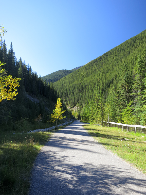 The trailhead for Utopia Mountain is not only easy to find, but it's also a paved multi-use trail for most of the first kilometre. To get there take the Miette Road south from Highway 16 (Yellowhead Trail), not far from the Jasper's eastern park gates, all the way to the road's end at the Miette Hot Springs. Once you arrive to this sprawling parking area, keep heading to your southwest until the lot ends at a paved trail headed downhill into the valley.