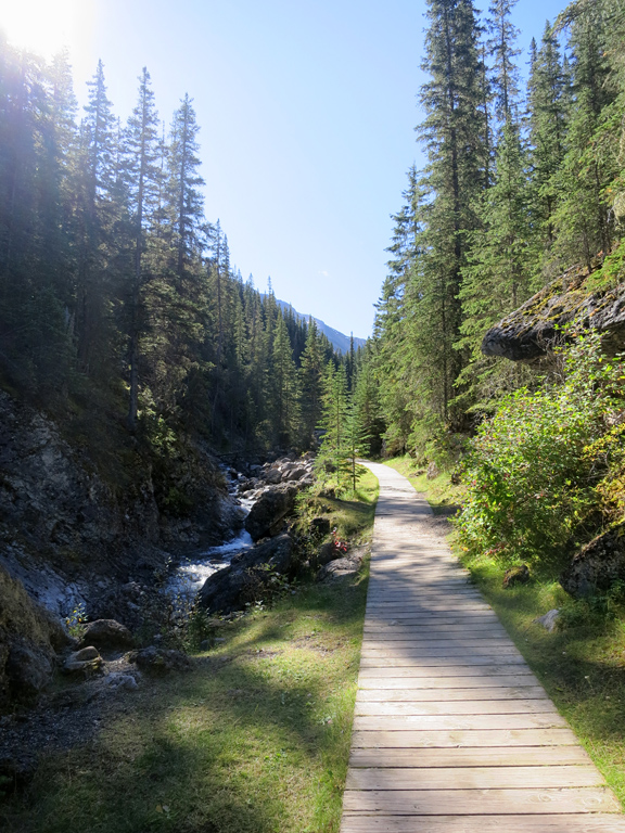 This trail will eventually lead you to the old hot spring pools (now an abandoned building), which you can detour around to left (east) to reach a well-maintained hiking trail (for the Sulphur Skyline) which continues south along the creek. At around the 1.3 km mark you will reach a footbridge that crosses the creek and leads the trail uphill through the forest. This is where you will leave the trail.