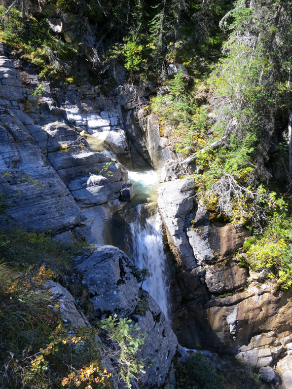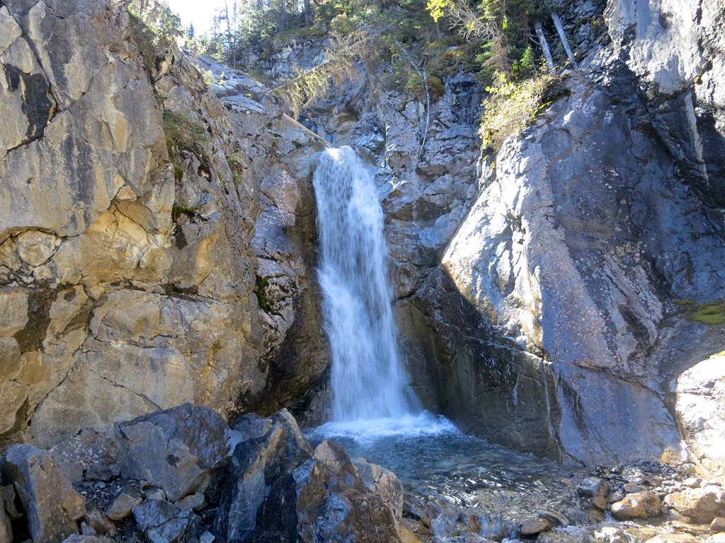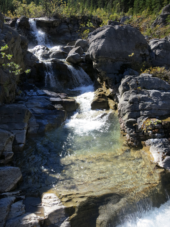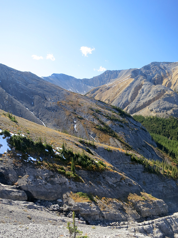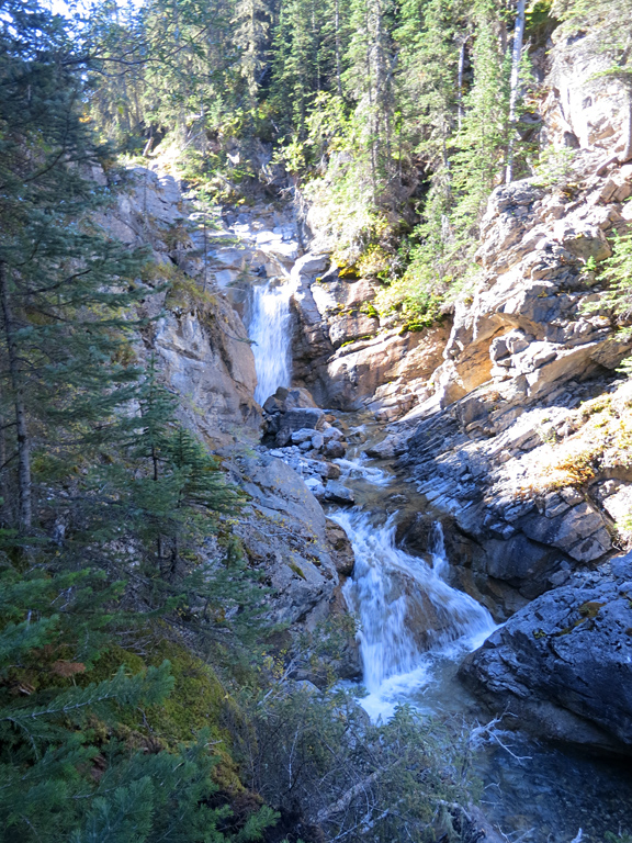 Once you've reached the base of the first false summit (as seen in the top left of this photo), follow the easy scree bypass around the crux section and, instead of retracing your steps towards the ridge you ascended earlier, continue down the gully towards Mt. O'Hagan (as seen in this photo). You'll want to stay a little to the skier's right of the gully's centre as you near the bottom to avoid some cliffs. Continue downwards until you eventually reach the creek (which could require some light bushwhacking) and then simply follow it downstream. The trail's pretty easy to follow, but there is a steep section next to largest waterfall where you'll want to make use of nearby trees for support. Continuing downstream will soon bring you back to where you diverted earlier, and your return route towards the trailhead.