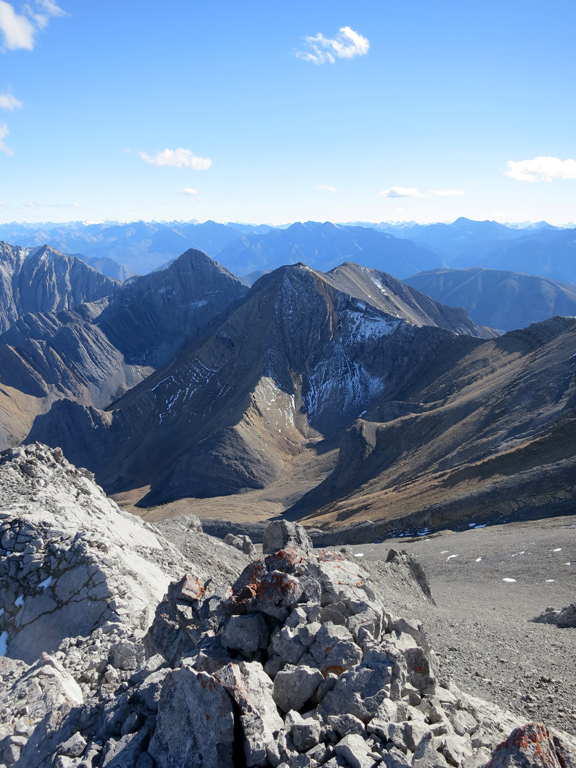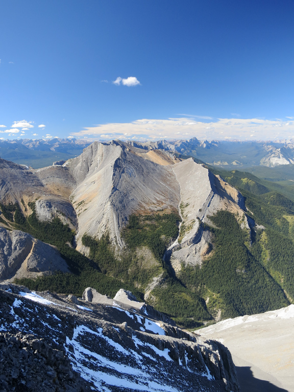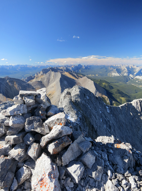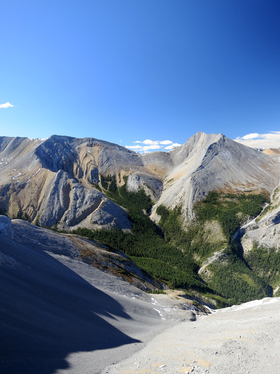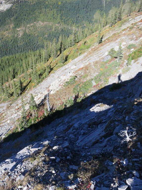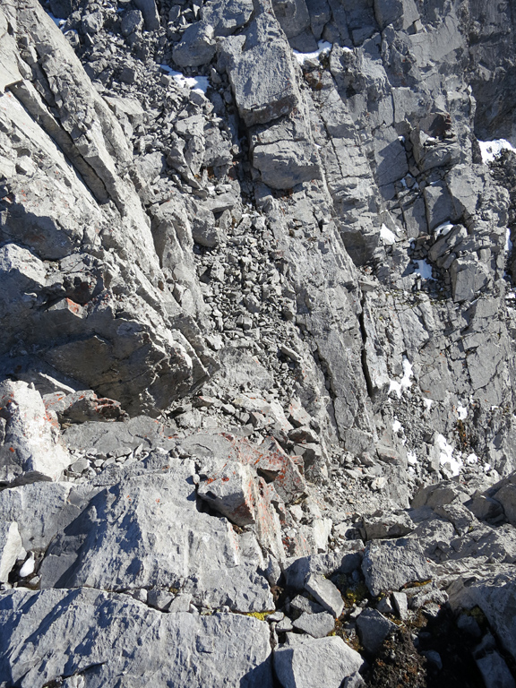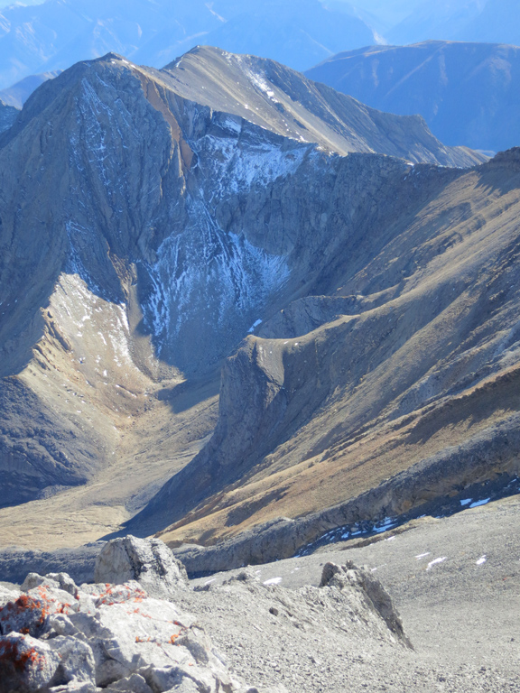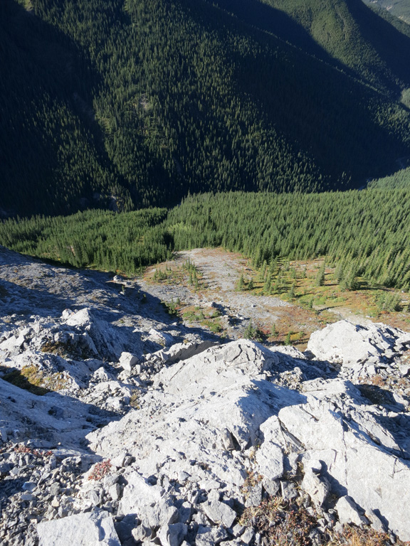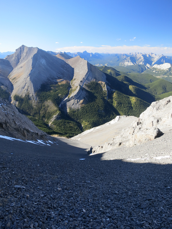 Once you're ready to depart the summit, simply retrace your steps to the shoulder of the first false summit where I recommend bypass down as the treadmill scree makes for a fast and enjoyable descent. It's around here where you can decide to continue to follow your ascent route through the first cliff bands, or take an alternative descent route as described under considerations.