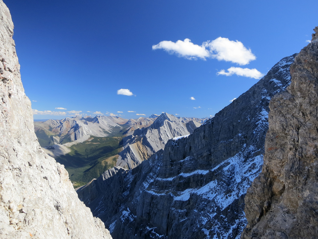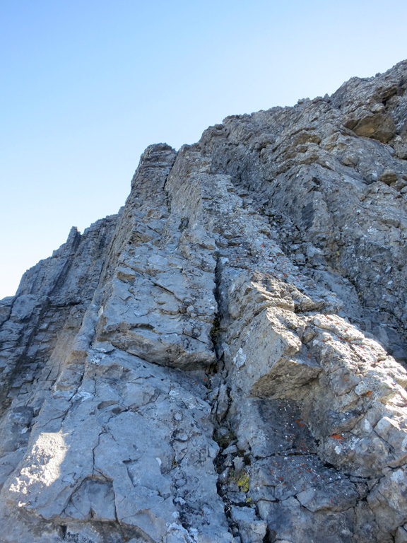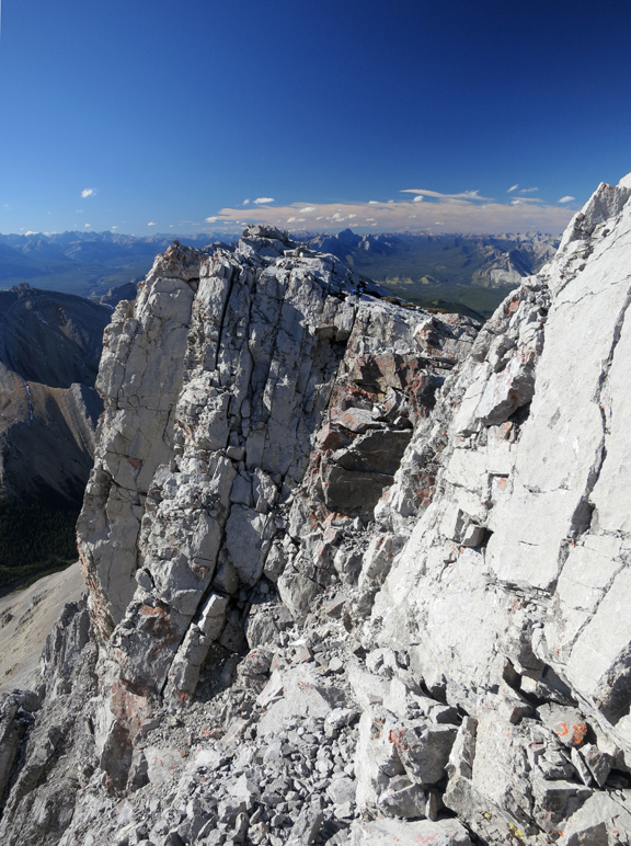 The ascent of Utopia Mountain is also described in detail in Alan Kane's Scrambles in the Canadian Rockies (pg.326). Note that Kane classifies this scramble as “difficult” due to the exposure risk encountered during the two crux sections (the first of which can be easily bypassed) mentioned above.