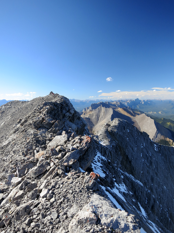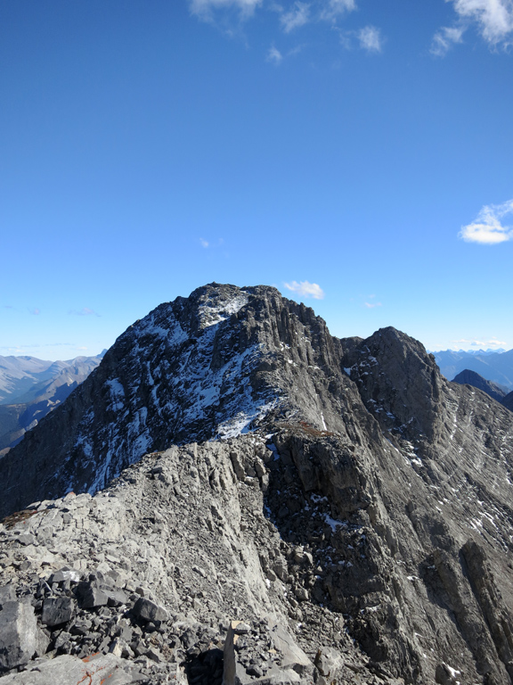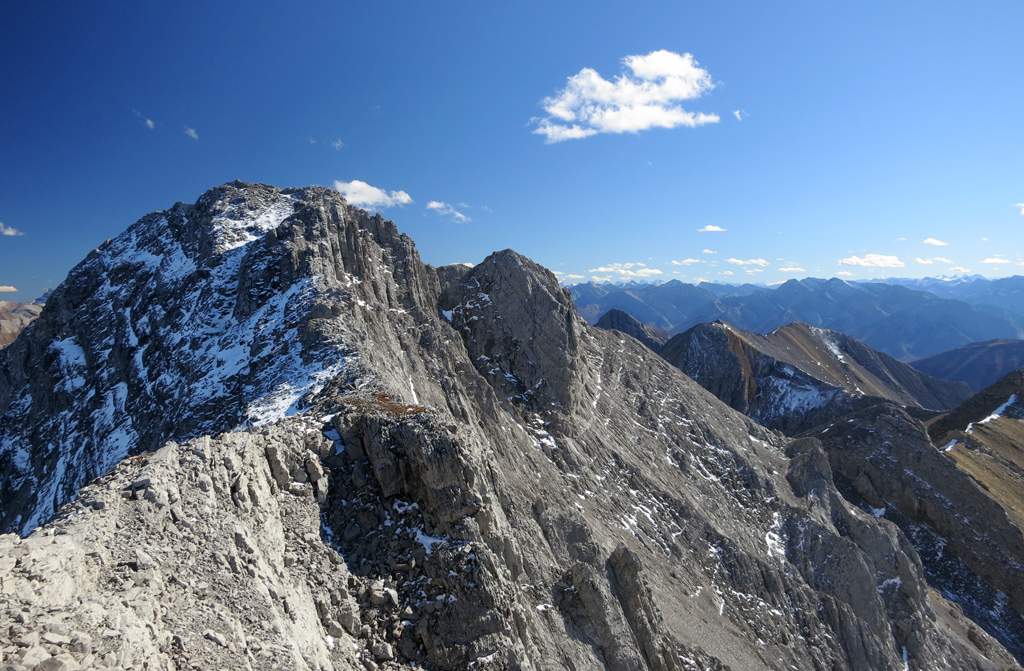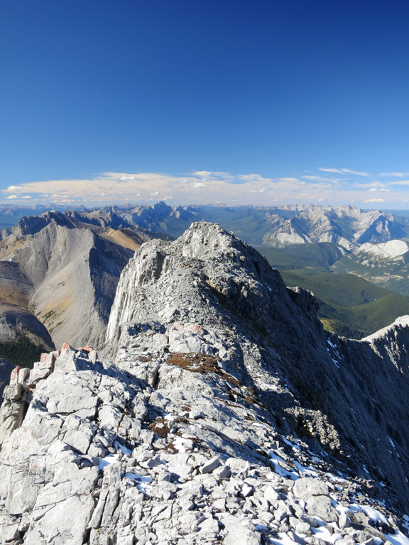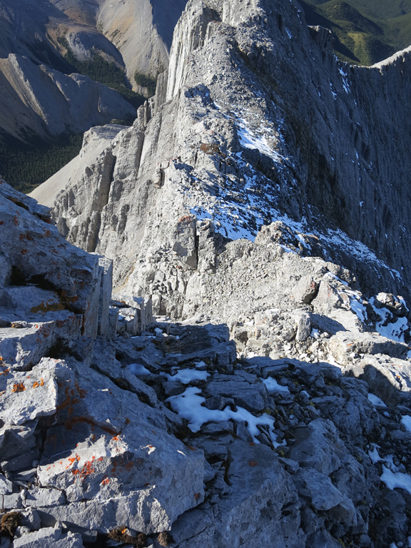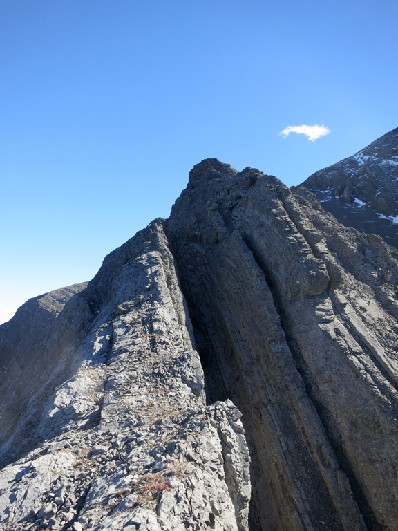As I knew I would be encountering challenging terrain on both Nigel Peak and Hawk Mountain that weekend, I decided to take the crux route for the ascent to make sure I was ready and to help me build up some confidence. The worst thing about the crux route is how it looks from the approach once you've gained the ridge. It looks incredibly narrow and steep; however, I found the scrambling to be much easier than I expected. There are good holds to be found, and the routefinding is fairly straight forward. That said, sections of the crux traverse are significantly exposed on both sides (but particularly to the west) and it can narrow to sidewalk width at points, so you still need to exercise a suitable level of care. I'd also suggest avoiding the crux completely if it's snow-covered, it's raining, or if the winds are particularly strong.