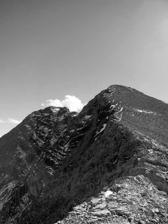 Once you've gained the second false summit you'll discover a cairn, a geological survey marker, and your first clear view of the narrow crux section which links with the true summit to the south. While the traverse itself is reasonably exposed, the challenge comes from a notch just before the summit itself. The notch requires a 2-3m downclimb to an area with significant exposure to the west. Similar to the first crux section, this looks worse than it is, and you'll soon find yourself scrambling the last few metres to the true summit its spectacular view to the south.