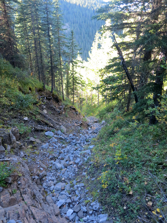 If you arrive to this drainage on your ascent, you've gone too far. You can trudge straight up the drainage to reach the right area, but are probably better off taking a few minutes to backtrack in search for the trail, which should be nearby on a parallel course.